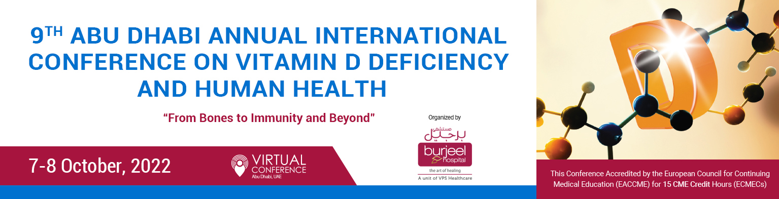 On behalf of the scientific and organizing committee, it is our great pleasure to announce and cordially invite you to “9th Abu Dhabi Annual International Conference on Vitamin D Deficiency and Human Health” to be held on 7-8 October, 2022 as a Virtual Conference, Abu Dhabi, UAE This event shall be focused on the theme “From Bones to Immunity and Beyond”.