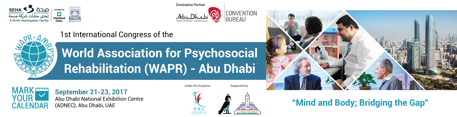 We are greatly honored to cordially invite you to attend and participate in the “1st Abu Dhabi International Congress of the World Association for Psychosocial Rehabilitation” which is scheduled to be held at Abu Dhabi National Exhibition Centre (ADNEC) in Abu Dhabi, United Arab Emirates from September 21-23, 2017 and hosted by Emirates Society of Mental Health, Sheikh Khalifa Medical City - Behavioral Sciences Pavilion, SEHA (Abu Dhabi Health Services) & National Rehabilitation Center of UAE.